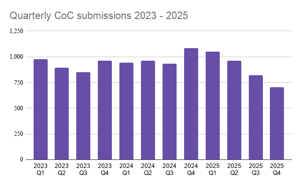 - In Q4 2025, 706 applications were submitted – the second lowest number recorded since the government began releasing statistics.